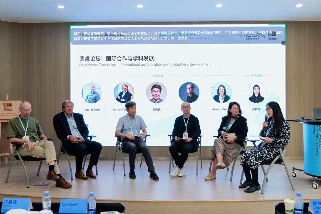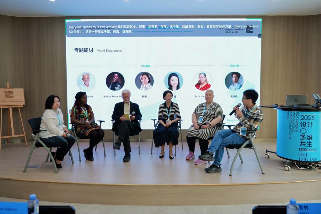 在随后的专题讨论中,巩淼森副教授主持,Ezio Manzini教授、Satu Miettinen教授、李俏教授、钟芳主任和Ralitsa Diana Debrah共同参与。Satu Miettinen强调应从本体论与知识论层面反思设计者的认知方式;李俏指出设计能为人文服务注入多元价值;钟芳分析了党建引领在中国协作实践中的轴心作用;Ralitsa探讨了去殖民化对非洲协作的影响。Manzini教授总结指出,设计应超越人类中心主义,关注更广泛的关系网络,并以“关怀”为纽带理解文化差异,推动跨文化协作。