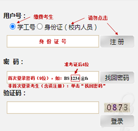 网上缴费平台”,完成缴费。考生账号已开通,切勿自行注册。收费标准:80元/生(仅申请考核考生,硕博连读考生无须缴费)。用户号在“学工号”输入正确的身份证号,初始密码(9位):“BS”+准考证编号后4位+“@fs”(准考证查看网址://yzgmis.yzsb88.org/zsgl/bswb/login.aspx),如“BS1234@fs”。非首次登录缴费系统的考生(含往年报考考生及误注册考生)请使用“找回密码”,登录并缴费。